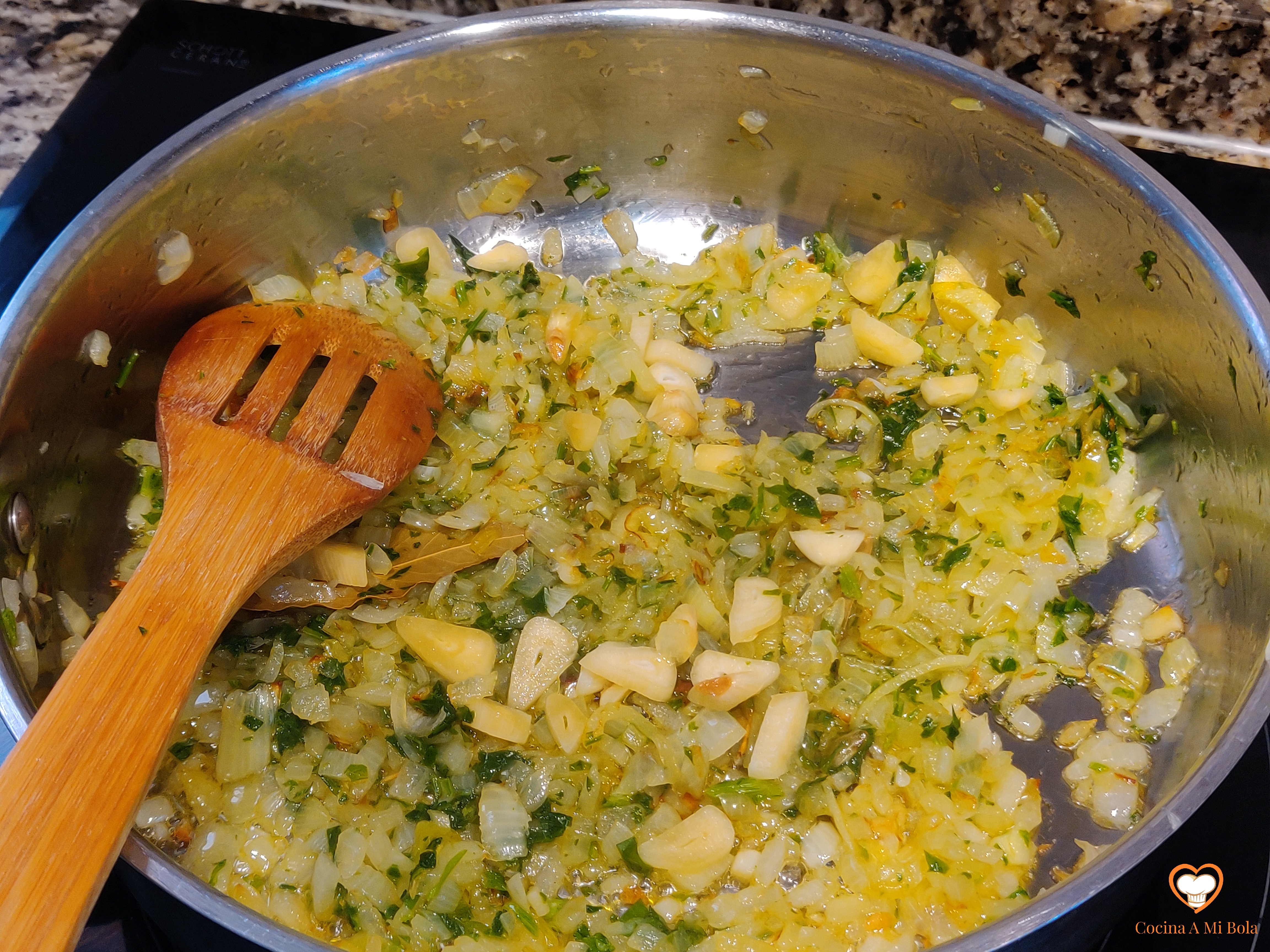 SEGUNDO.- Pica fino la cebolla y ponla a pochar en aceite de oliva virgen extra sobre una sartén o cazuela donde nos quepan los berberechos y que tenga tapa. Salpimenta y añade el laurel. Mantén un fuego moderado para que se haga despacio, pero si se tuesta ligeramente, no pasa nada. De hecho yo lo provoco, porque me gusta el resabor que deja a la salsa. Pero insisto; muy ligeramente.