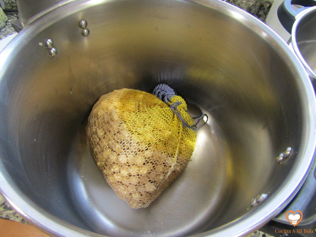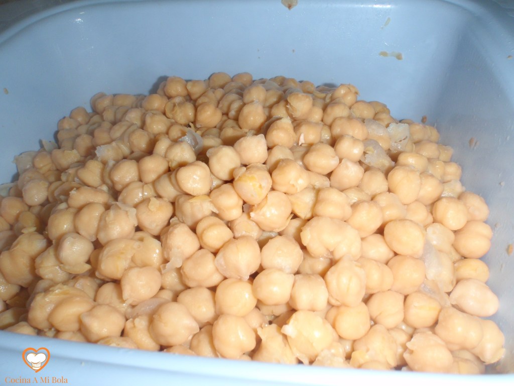PRIMERO.- Necesitaremos 400 gramos de garbanzos ya cocidos. Tú verás si te compensa ponerlos en remojo la víspera y cocerlos, o bien comprarlos ya cocidos. Los venden en envases de vidrio al vacío de una calidad magnífica y lo único que has de hacer es lavarlos muy bien para que desaparezca ese resabor que les da el agua salina en la que vienen conservados. Lávalos bien bajo el grifo y sumergiéndolos. Verás que al entrar en contacto con el agua del grifo, generan una espuma limpia y blanca. Lávalos hasta que no haya espuma.
